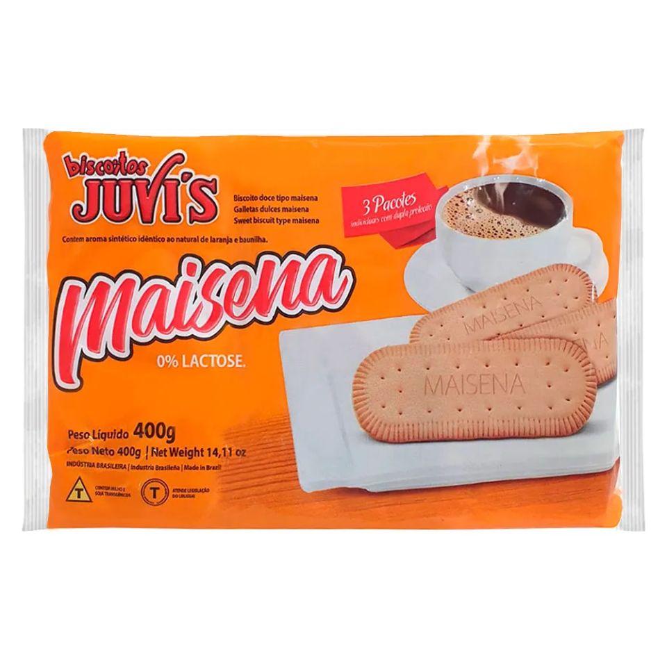 Biscoito doce tipo maisena sem lactose, crocante e de sabor suave. Ideal para ser consumido puro ou para uso culinário. Embalagem de 400g.