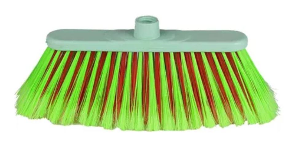 Vassoura com capa em resina virgem e fios plumados duplamente estabilizados que permitem mais maciez na varrição e durabilidade da vassoura.
